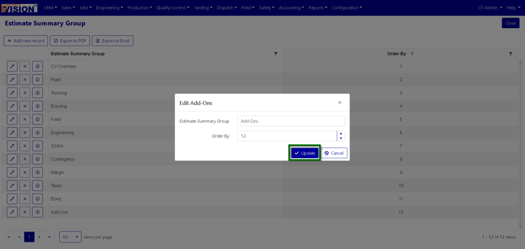 - Click on the “Update” button to Add the new Estimate Summary Group (see the Green box in Figure 3).