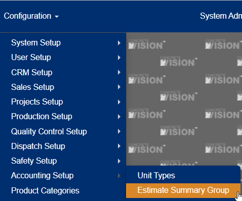 You access the Estimate Summary Group screen from the Configuration > Accounting Setup sub-menu, shown below.