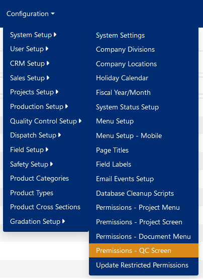 You access the QC Screen Permissions Setup Screen from the Configuration > System Setup > Permissions - QC Screen, as shown below: