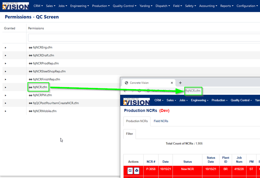 The QC Permissions setup screen shown in figure 2, lists the various QC screens available. Each "Filename" is a different screen within the system, with distinct permissions. The "fqNCR.cfm" file for example contains the permissions for the "Production NCR" screen (Quality Control > Production NCRs).