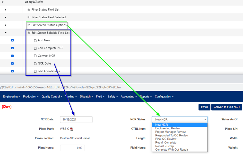 The 4th permission group, "Edit Screen Editable Field List" (marked with the blue rectangle in figure 4), allows you to specify which fields are editable to the user, such as the "NCR Date", or which actions the user is allowed to perform, such as "Convert to Field NCR", on the add/edit screen.