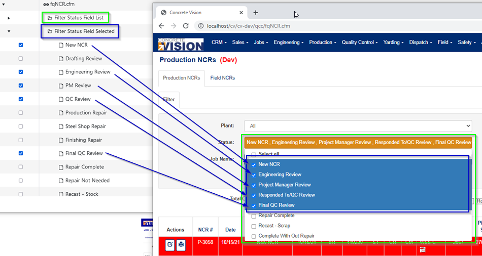 The first permission group, "Filter Status Field List" (marked with the green rectangles in figure 3), allows you to limit the statuses the user is allowed to see/filter by on the list screen.