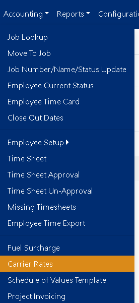 To get to the Carrier Rates screen, use the Accounting tab on the main menu at the top of the screen, then click on Carrier Rates (Figure 1 below).