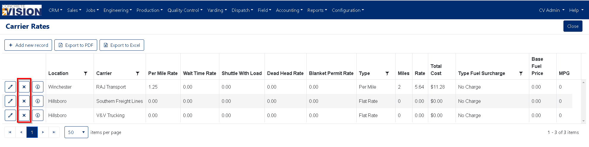 To delete a carriers rates, click on the "X" delete button (Red box in Figure 5) on the row associated to the rates you would like to delete and confirm you would like to delete the rates.