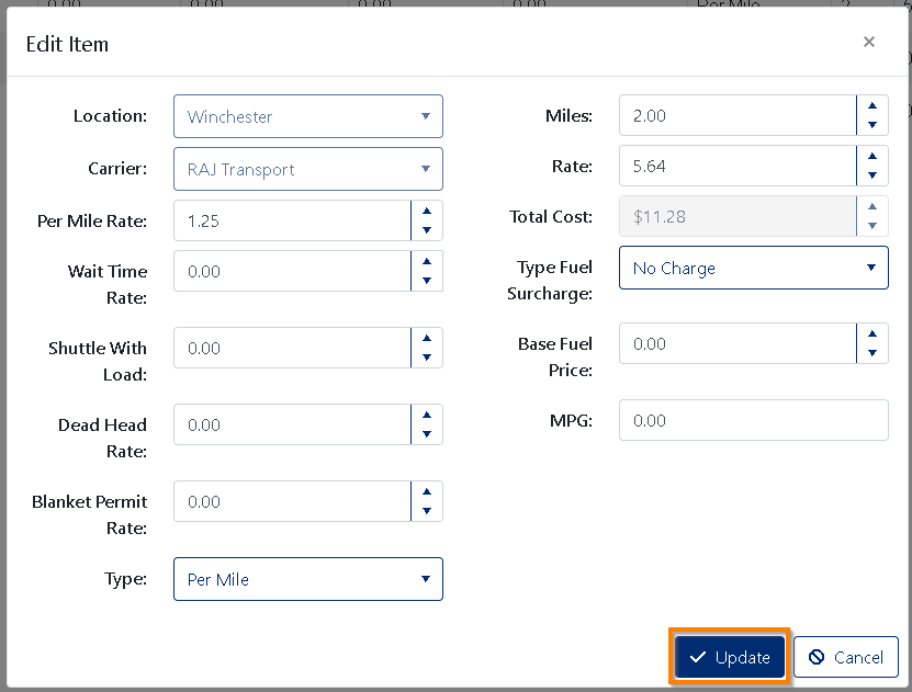 - Click on the “Update” button to Add the new Carrier Rate (see the Orange box in Figure 3)