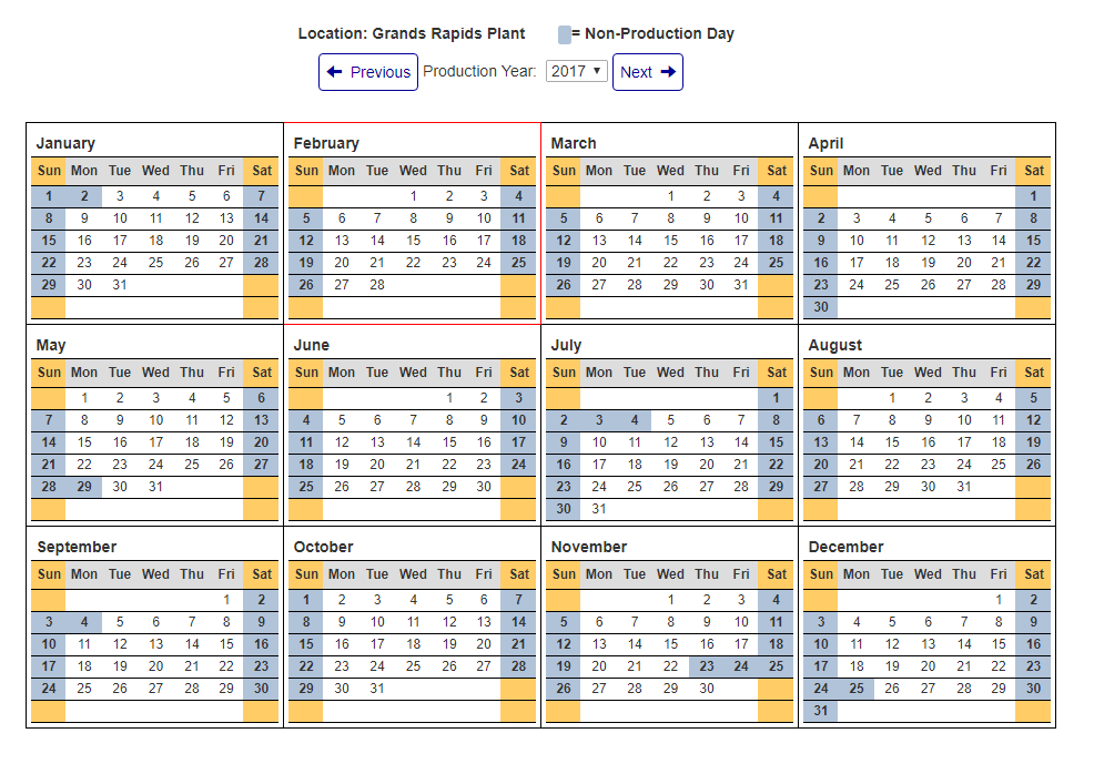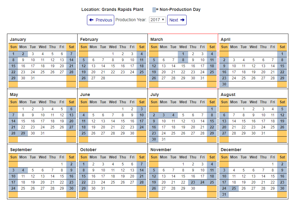 - By using the "Production Year" selector above the calendar, you can select a specific year from a list ranging from 4 years prior to the current year to 5 years after the current year to view. Upon clicking on the desired year to view, the screen should re-load to display the chosen years production calendar.