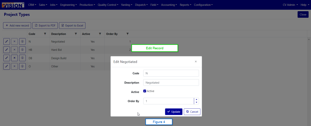The Project Types list is where you will see all of the created project types and can Add, Edit or Delete records. (Figure 2)