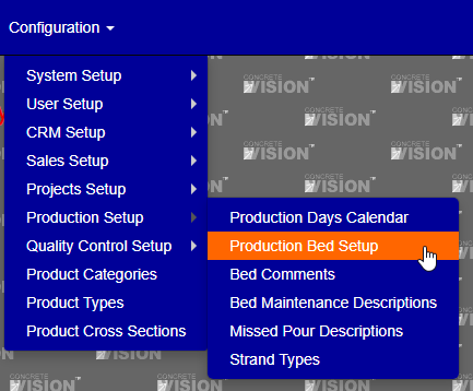You access the Production Bed Setup from the Configuration menu > Production Setup > Production Bed Setup (Figure 1).