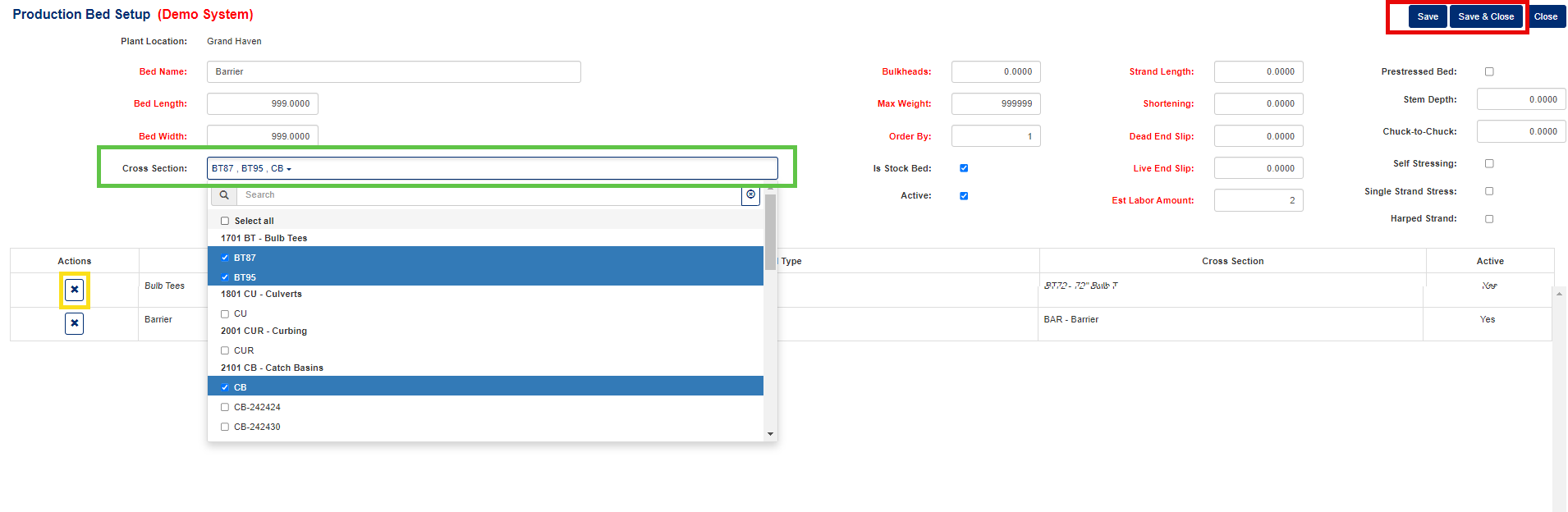 - Active is a checkbox that indicates if the bed is active or not, if not active it will not show up on the Production Planning screen.
