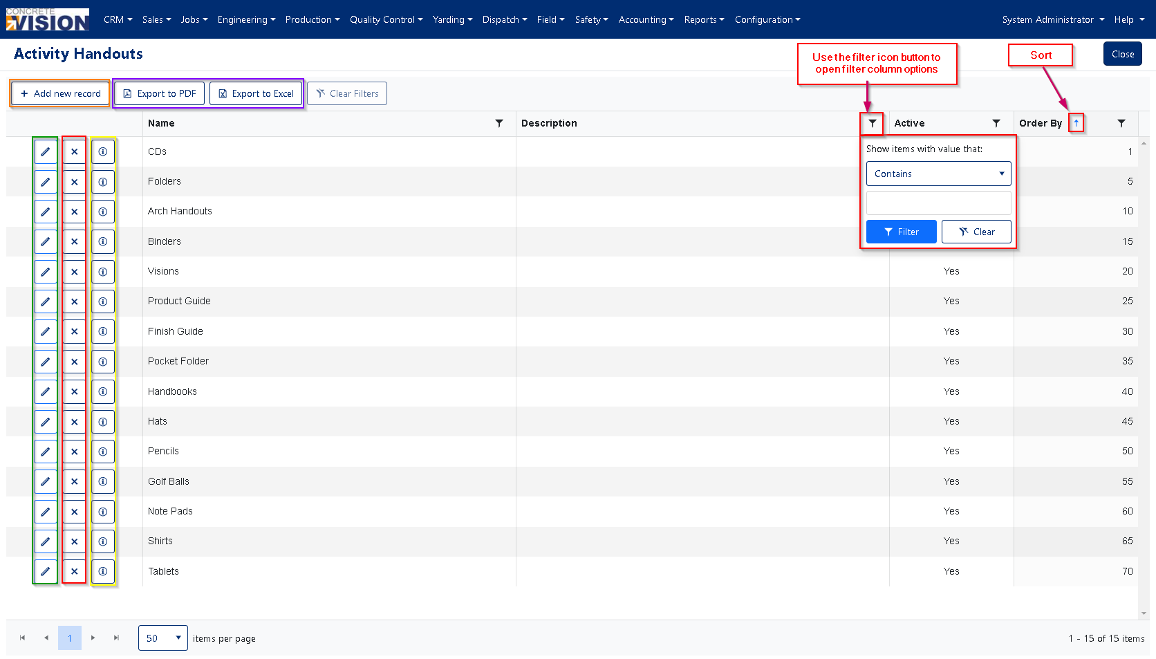 - Filter: Use the filter boxes in the grid header to search for specific criteria (Red outline - Figure 2)