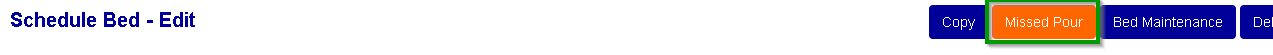 Establish Missed Pour Descriptions for use when a production bed pour is missed. Those active Missed Pour Descriptions will be shown within the "Production-> Production Planning - Edit" menu. From the Production Planning screen find the bed you'd like to schedule maintenance by double clicking on the blue bed diagram(See Below Figure 1).. From the "Schedule Bed -Edit" page, click on the "Missed Pour" button (See Below Figure 2). The Missed Pour Descriptions activated from the "Configuration -> Production Setup -> Missed Pour Descriptions" screen will be found as a drop list option box labelled Description. (See Below Figure 3)