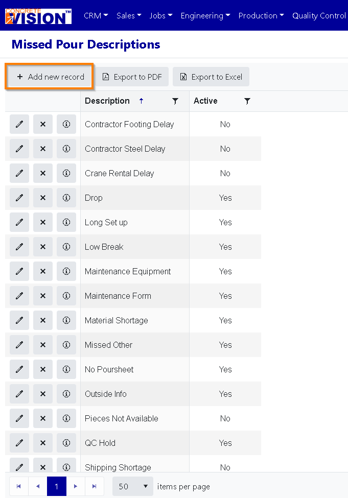 The Missed Pour Descriptions screen (Figure 4) is where you can add and edit Missed Pour Descriptions.