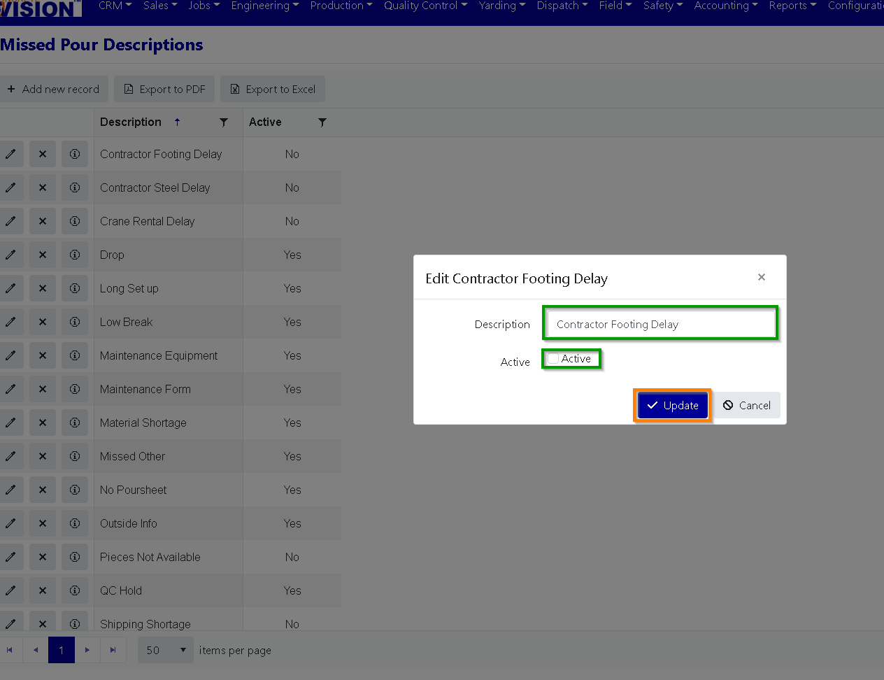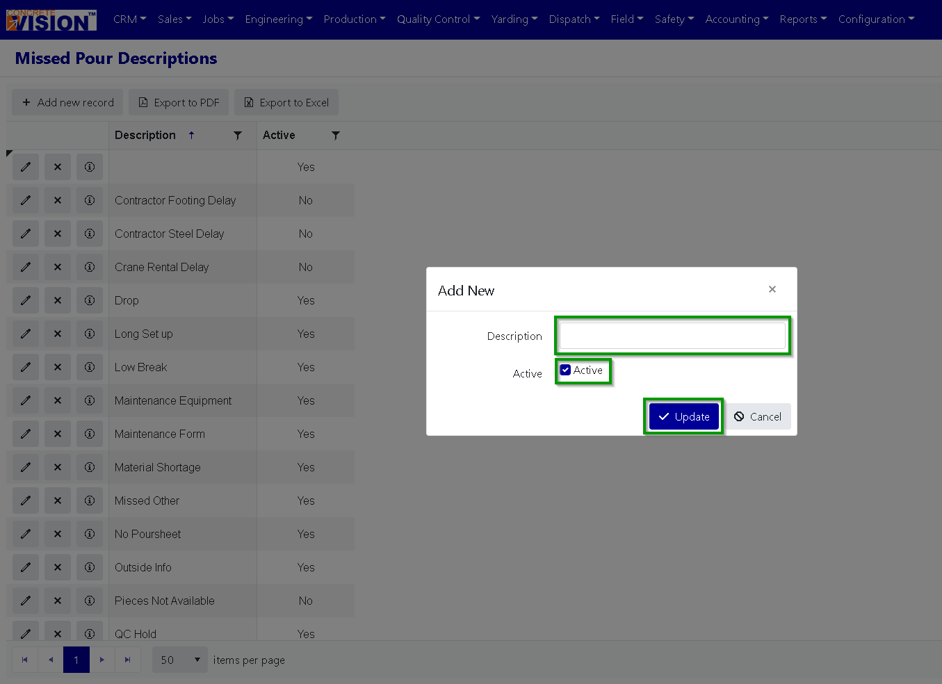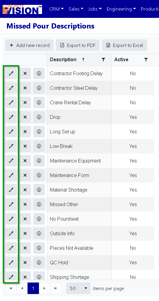 Click on the "edit" button to the left of the Missed Pour Descriptions you'd like to edit (Green box in Figure 7). That will open the Missed Pour Description Edit modal (see Figure 8).
