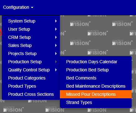 You access the Missed Pour Descriptions from the Configuration > Production Setup menu (Figure 4).