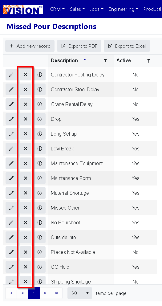 - Click the "delete" button to the left of the Missed Pour Descriptions you'd like to remove (Red box in Figure 2).