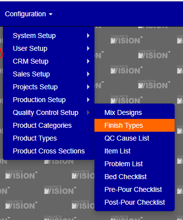 You access the Finish Types from the Configuration > Quality Control Setup menu (Figure 1).