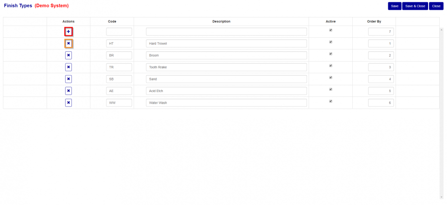 To edit an Finish Type, just update any one of the column values and then select the “Save” or” Save & Close” button to save your changes. If you don’t click on either the “Save” or “Save & Close” button and navigate off this screen, your changes will be lost.