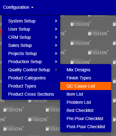 You access the QC Cause List from the Configuration > Quality Control Setup menu, shown below (Figure 1)