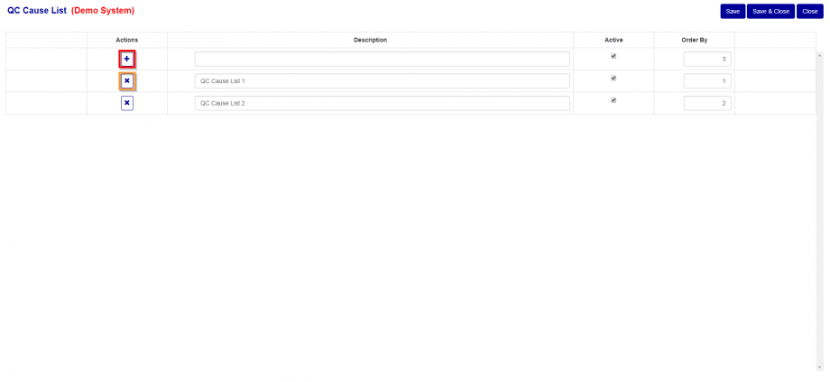 To edit an QC Cause, just update any one of the column values and then select the “Save” or” Save & Close” button to save your changes. If you don’t click on either the “Save” or “Save & Close” button and navigate off this screen, your changes will be lost.
