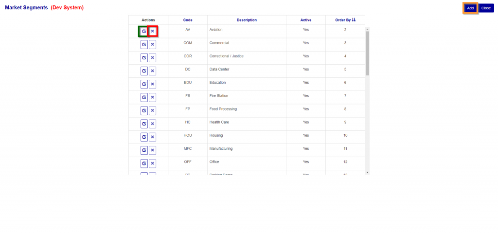 To delete a Market Segments, just click on the delete button of the Market Segments (Green Box to the right of the Edit Button (Red Box) in Figure 2) you wish to delete. You can only delete a Market Segments that does not currently have any details assigned to it. If the Market Segments has details assigned to it, the delete button will be disabled.