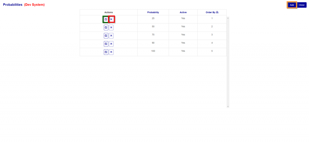 To delete a Probabilities, just click on the delete button of the Probabilities (Green Box to the right of the Edit Button (Red Box) in Figure 2) you wish to delete. You can only delete a Probabilities that does not currently have any details assigned to it. If the Probabilities has details assigned to it, the delete button will be disabled.