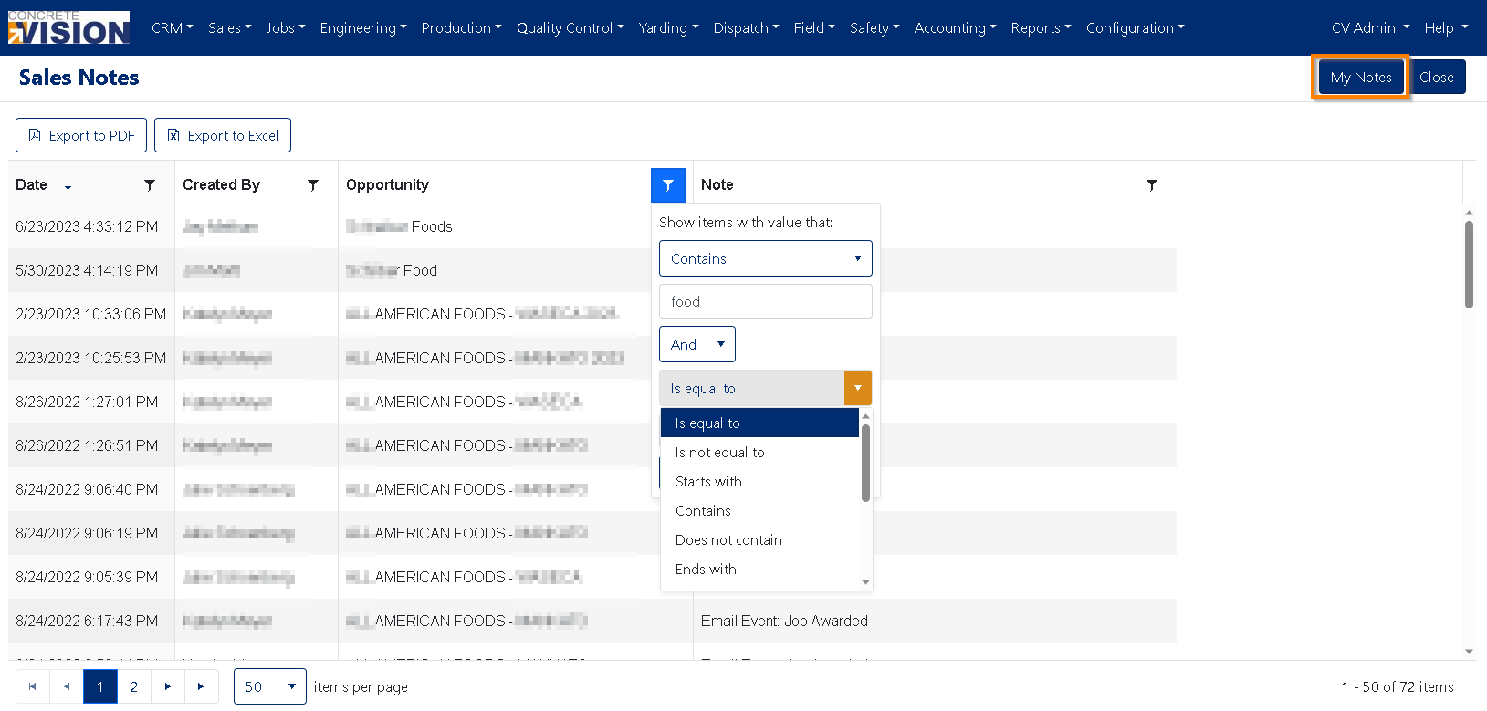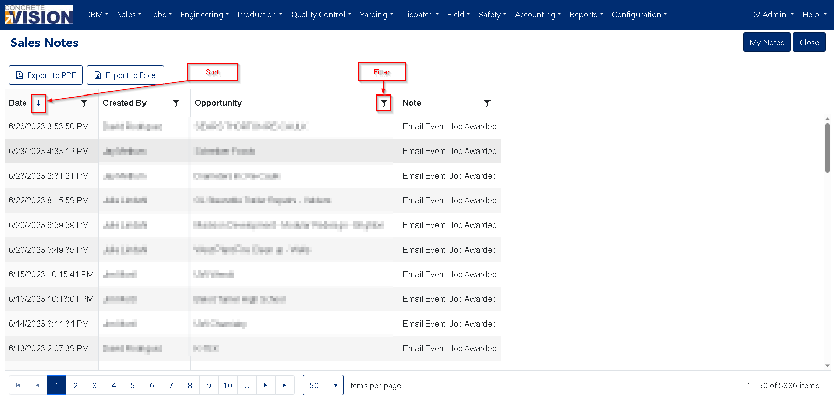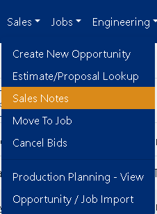 The Sales Notes screen allows you to easily view all Sales notes or filter for specific notes based on: An Opportunity Name, A Date Range, or A Note Creator.