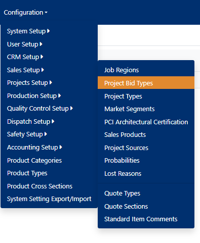 Navigate to Configuration menu > Sales Setup > Project Bid Types (see Figure 1).