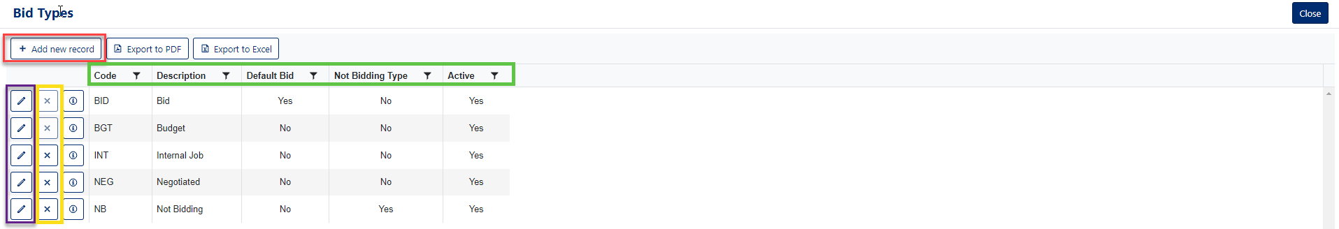 Note: You can only delete bid types that have no associated project details. If a bid type is currently in use, the delete button will be disabled.