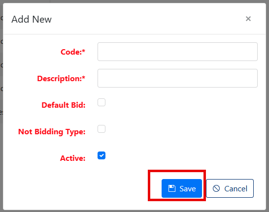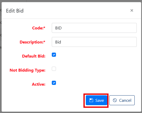- Code (Required) - Enter a unique identifier for the bid type