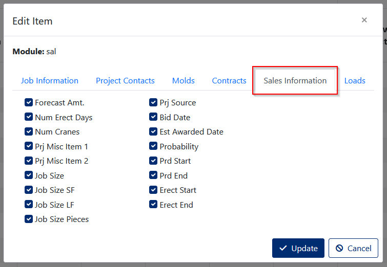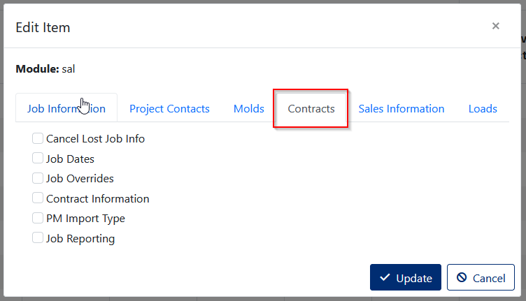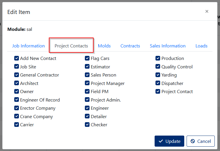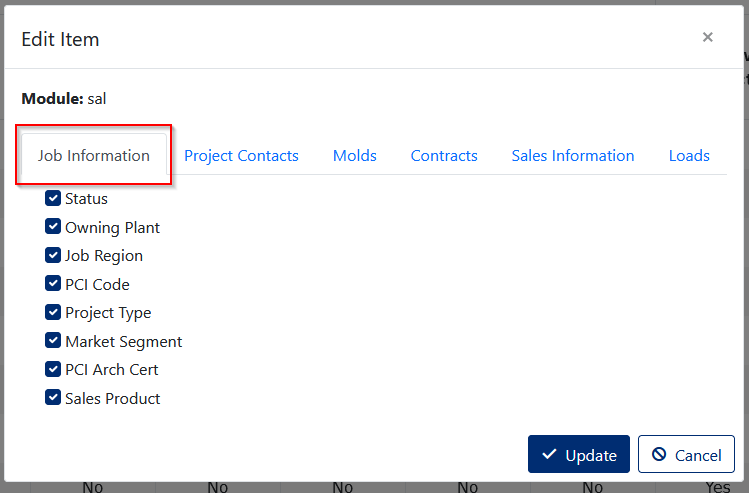 The screen is used to change permissions for different fields on Jobs Information Tab, Project Contacts Tab, Molds Tab, Contracts Tab, Sales Information Tab and Loads Tab.