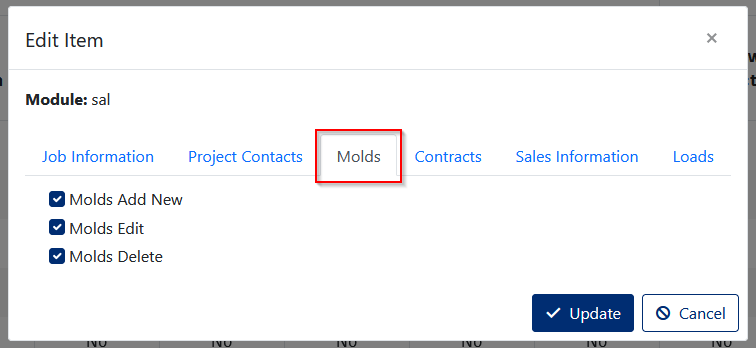 In the Molds Tab (Red Box in Figure 7) section of the screen it will allow you to modify if a module will be able to Add, Edit or Delete Molds (Red Box in Figure 8)