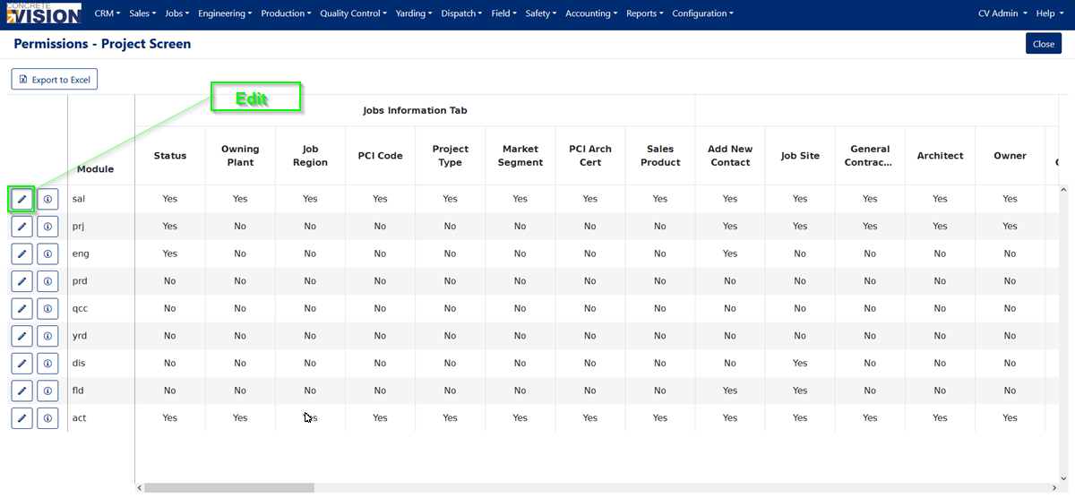 This screen lists the permissions for the different project fields under the different screens (Job Information, Project Contacts, Molds, Contracts, Sales Information, Loads, etc.) for each module. To edit permissions for specific module, click on the “edit” button as shown in Figure 2.