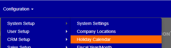 You can navigate to the Holiday Calendar screen from the Configuration menu, then System Setup sub-menu (Figure 1)