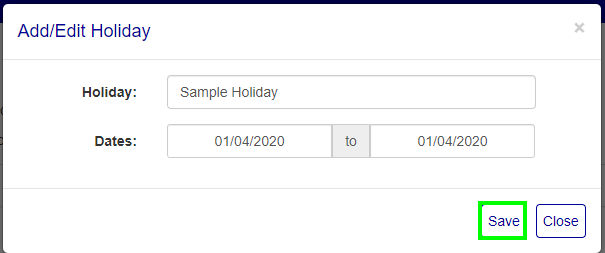 To add a holiday, click on a date (or click and drag for extended holidays) and a window will open for you to enter the name and date range of the Holiday (Figure 3). Once the information has been entered in, press the save button on the window (Green Box Figure 3) and the Holiday will appear on the calendar.