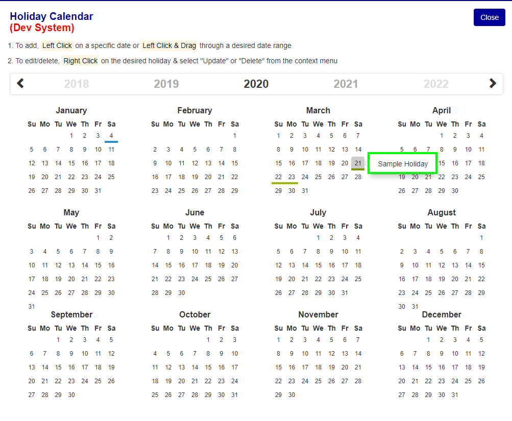 From the main screen you can see the entire calendar year. There are some hints at the top of the screen should you forget how to navigate/edit the calendar. As the instructions say, you can either click on a single date or click and drag across multiple dates, to create an extended holiday. Below you can see 2 separate sample holidays that have been created, 1 on January 4th, and 1 extended holiday on March 21st through March 23rd. Holidays are denoted on the calendar by a colored underline under the date(s) of said Holiday (blue for the first holiday, and green for the second holiday mentioned above). To view the name or entry for the holiday, Hover your mouse over the underlined date and a popup will appear with the name of the holiday (Green box Figure 2).