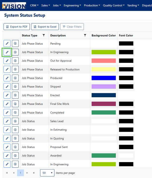 - Click the pencil icon (edit button) in the row of that status (Figure 2 - Green box)
