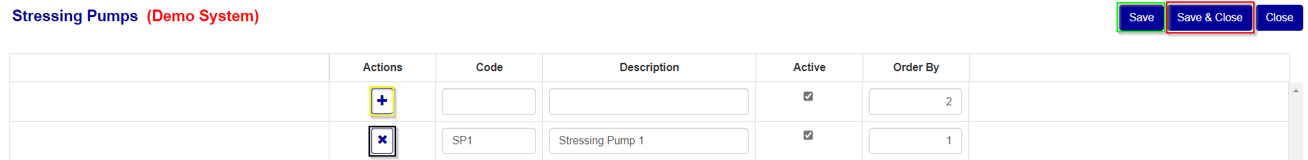 To edit any Stressing Pumps, change the values on the row of the strand type you wish to edit, then click the “Save” (Green box Figure 2) or the “Save & Close” button (Red button Figure 2).