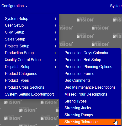 You access the Stressing Tolerances screen from the Configuration > Production Setup menu (Figure 1).