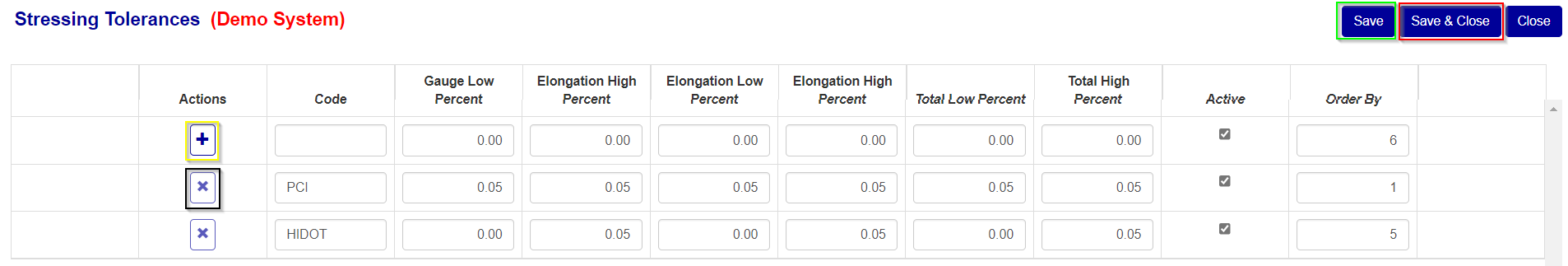 To edit any Stressing Tolerances, change the values on the row of the strand type you wish to edit, then click the “Save” (Green box Figure 2) or the “Save & Close” button (Red button Figure 2).