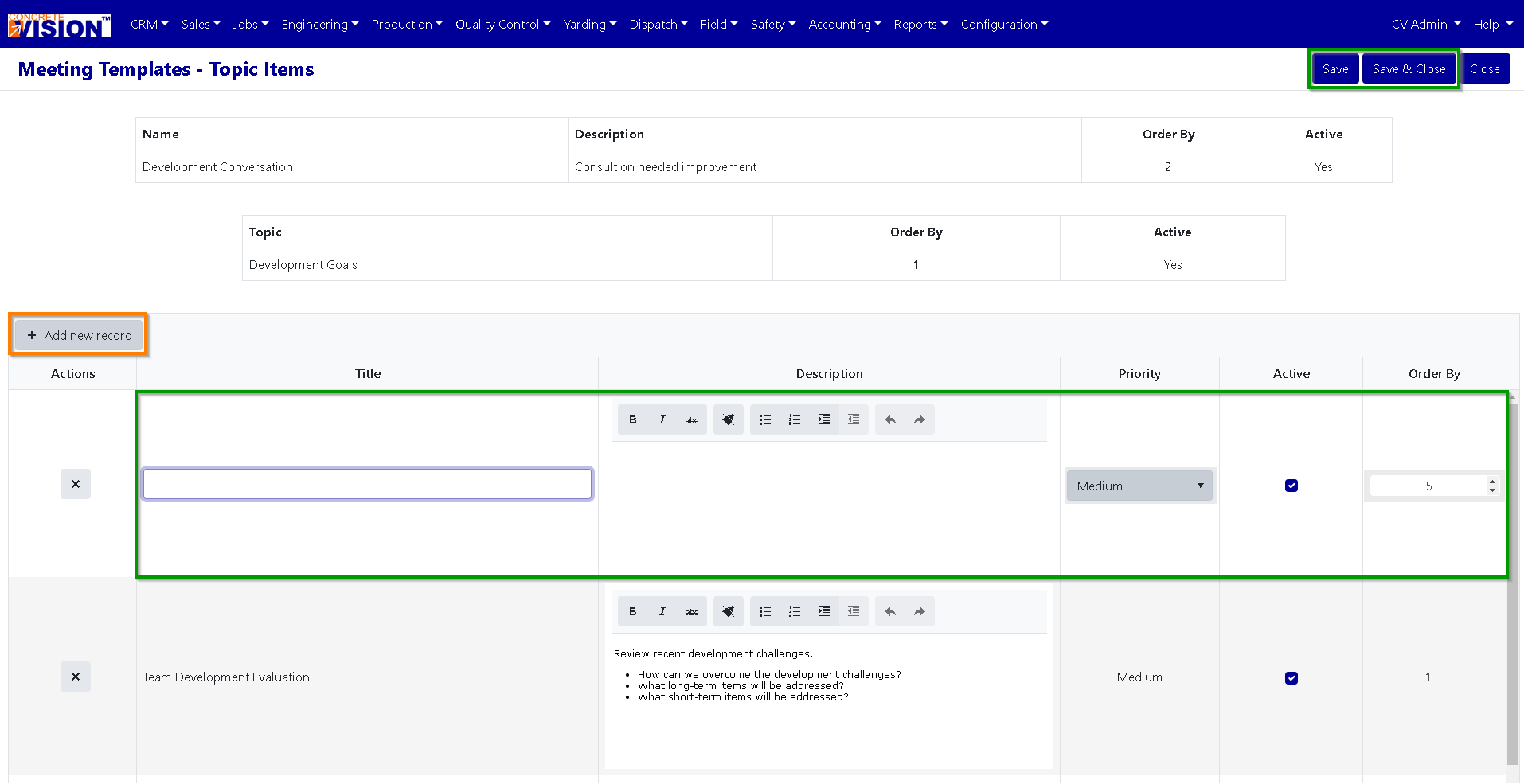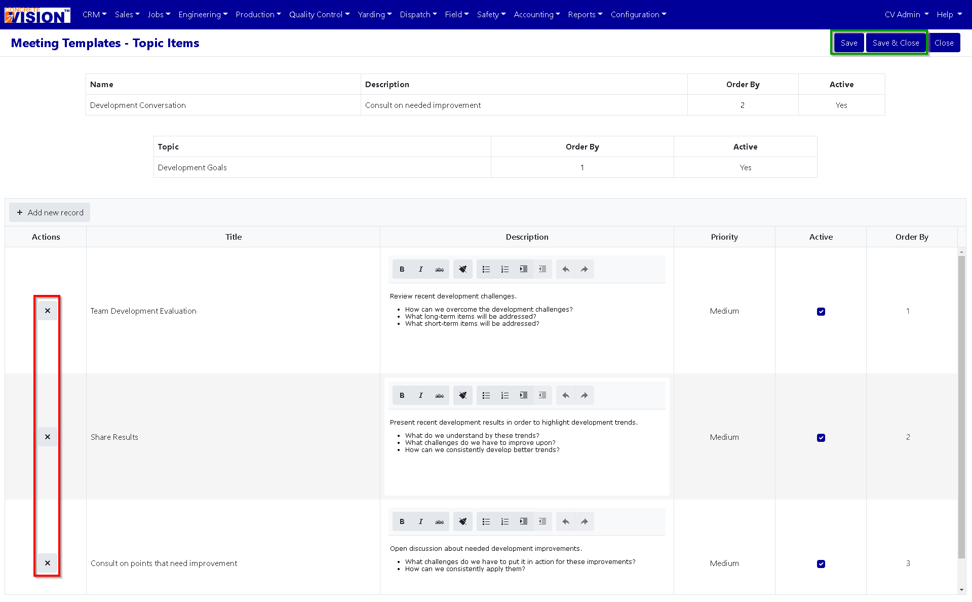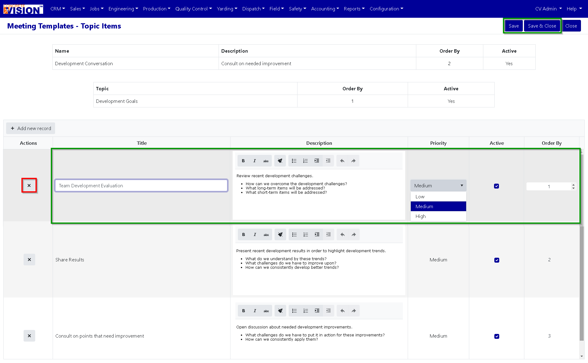To delete a Meeting Templates Topic Item, just click on the delete button of the Meeting Templates Topic Item (Red Box to the left of the Topic Item’s name (Red Box) in Figure 4) you wish to delete. Click the [Save] (Green Box top right of Figure 4) to save the deletion.
