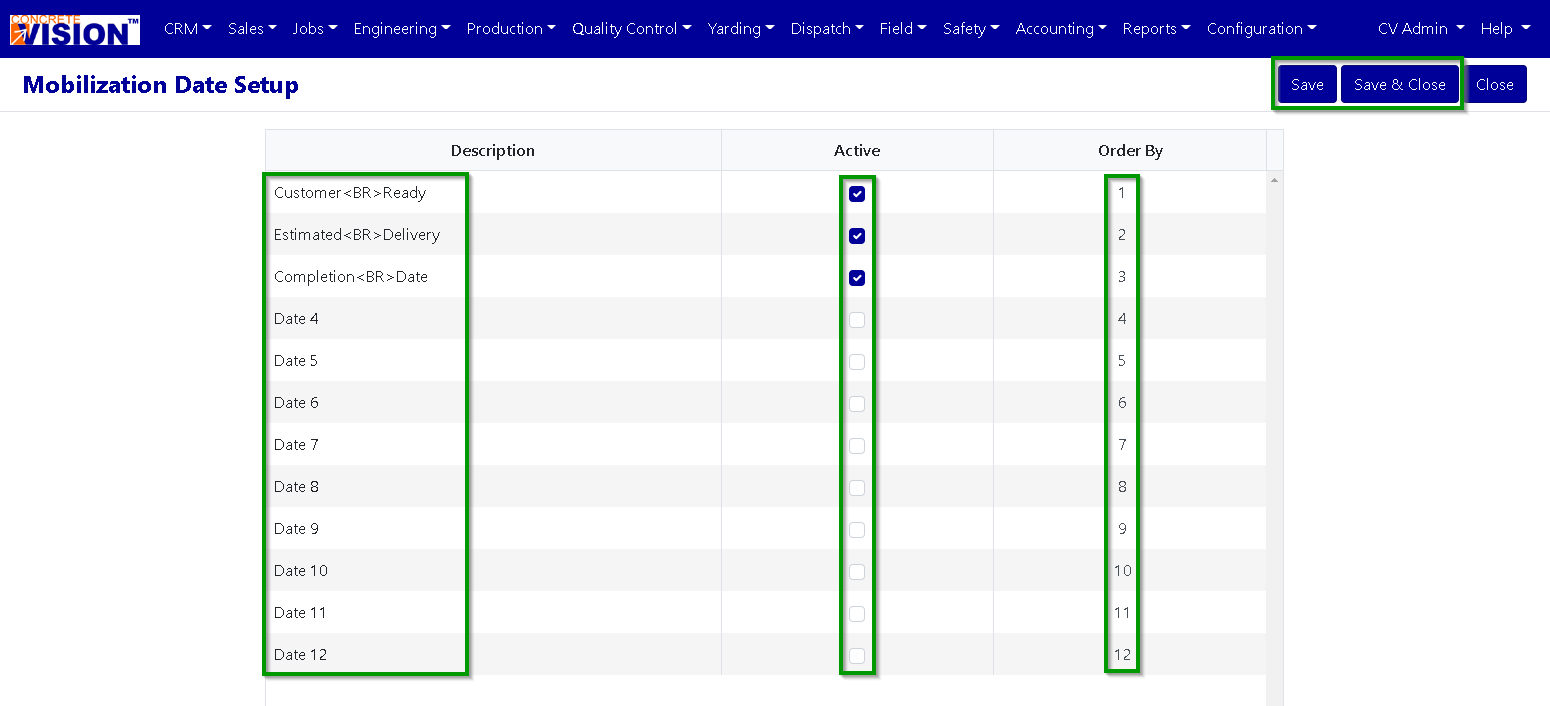 Note: Leaving the screen after making changes will not be saved unless the Save or Save & Close buttons are used.