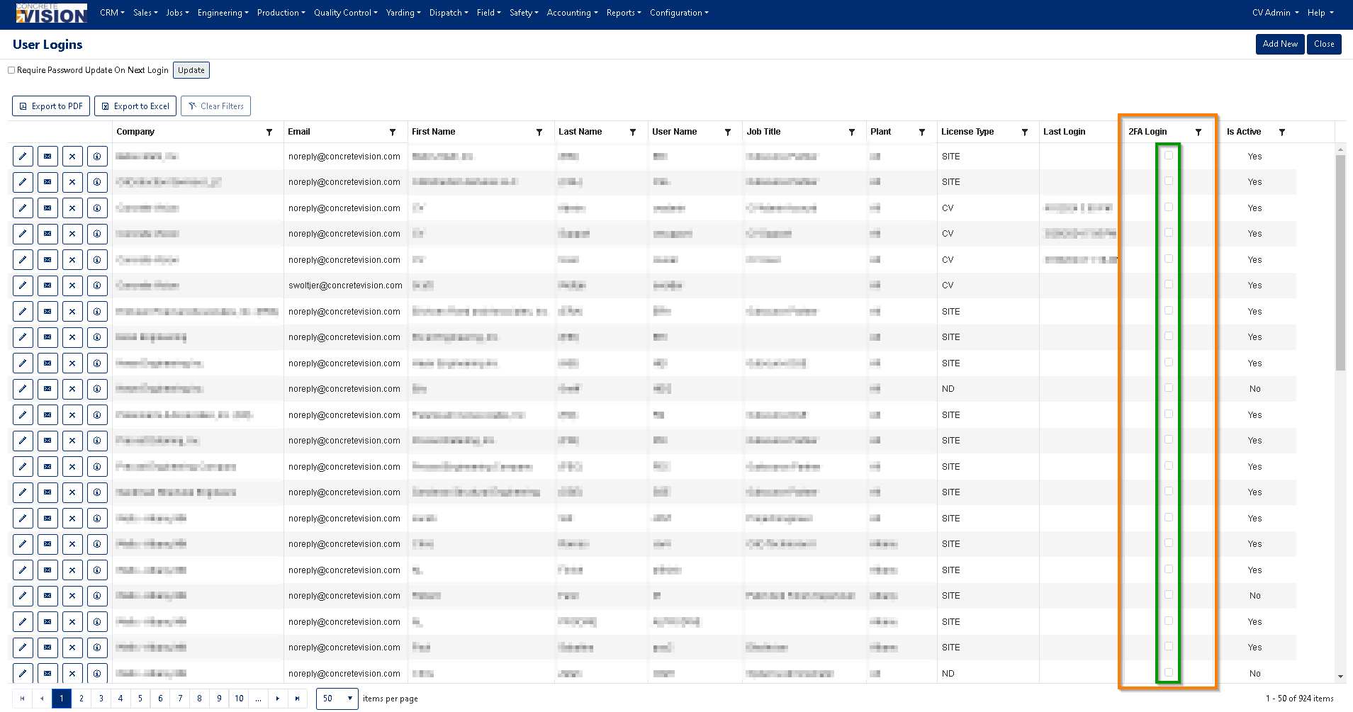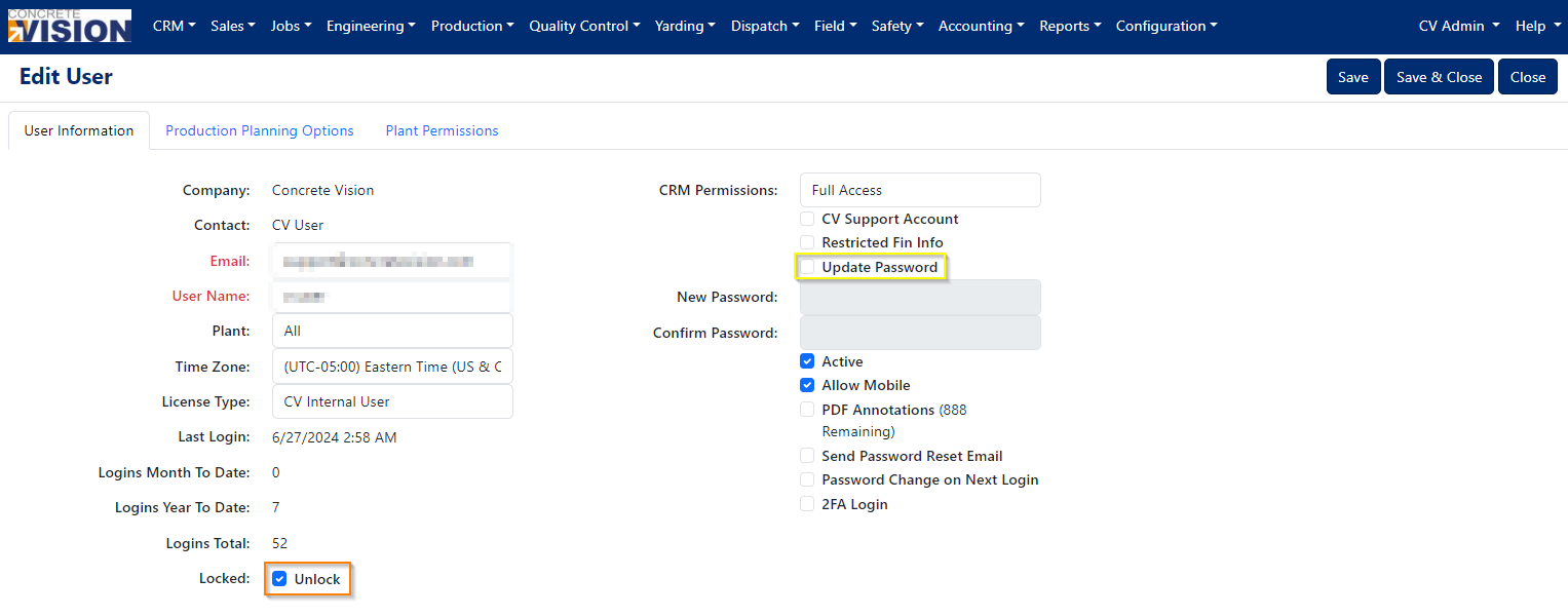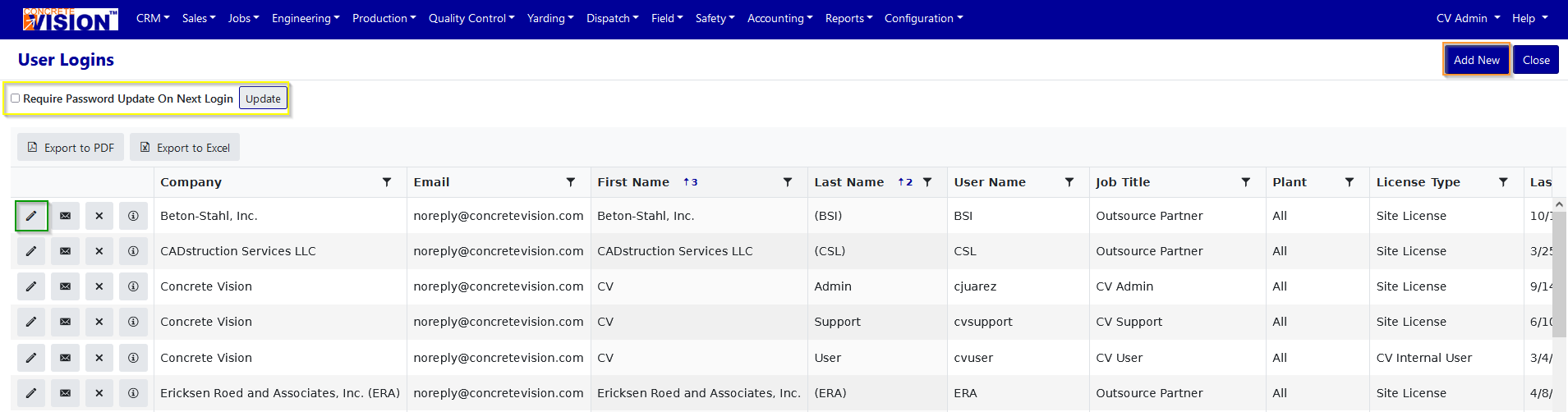The User Logins screen allows administrators to manage Concrete Vision users with capabilities to:
