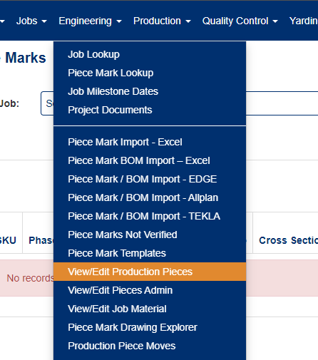 1. Navigate to Engineering menu > View/Edit Production Pieces. (see Figure 1)