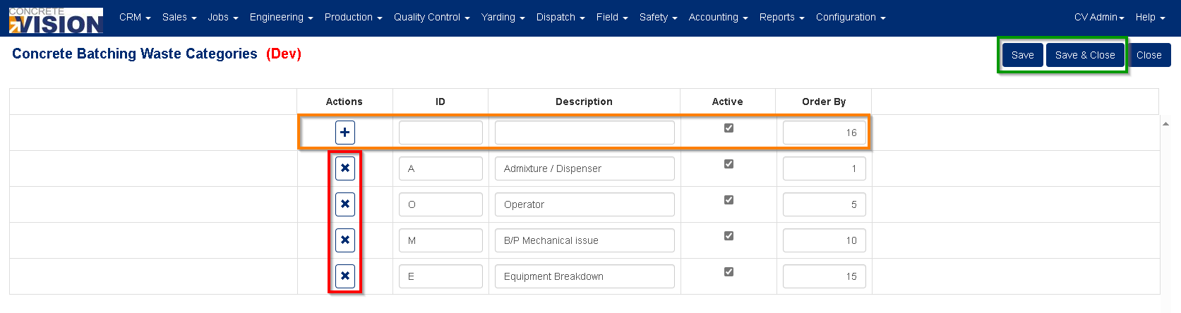 - Set the new Concrete Batching Waste Category as Active or Inactive.