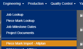 You can access the screen from the "Engineering > Piece Mark Import - AllPlan" menu, as shown in Figure 1. This screen allows you to import pieces into the Concrete Vision Engineering module, where they are maintained for final review, before they are moved to Production (see end of the article for more information).