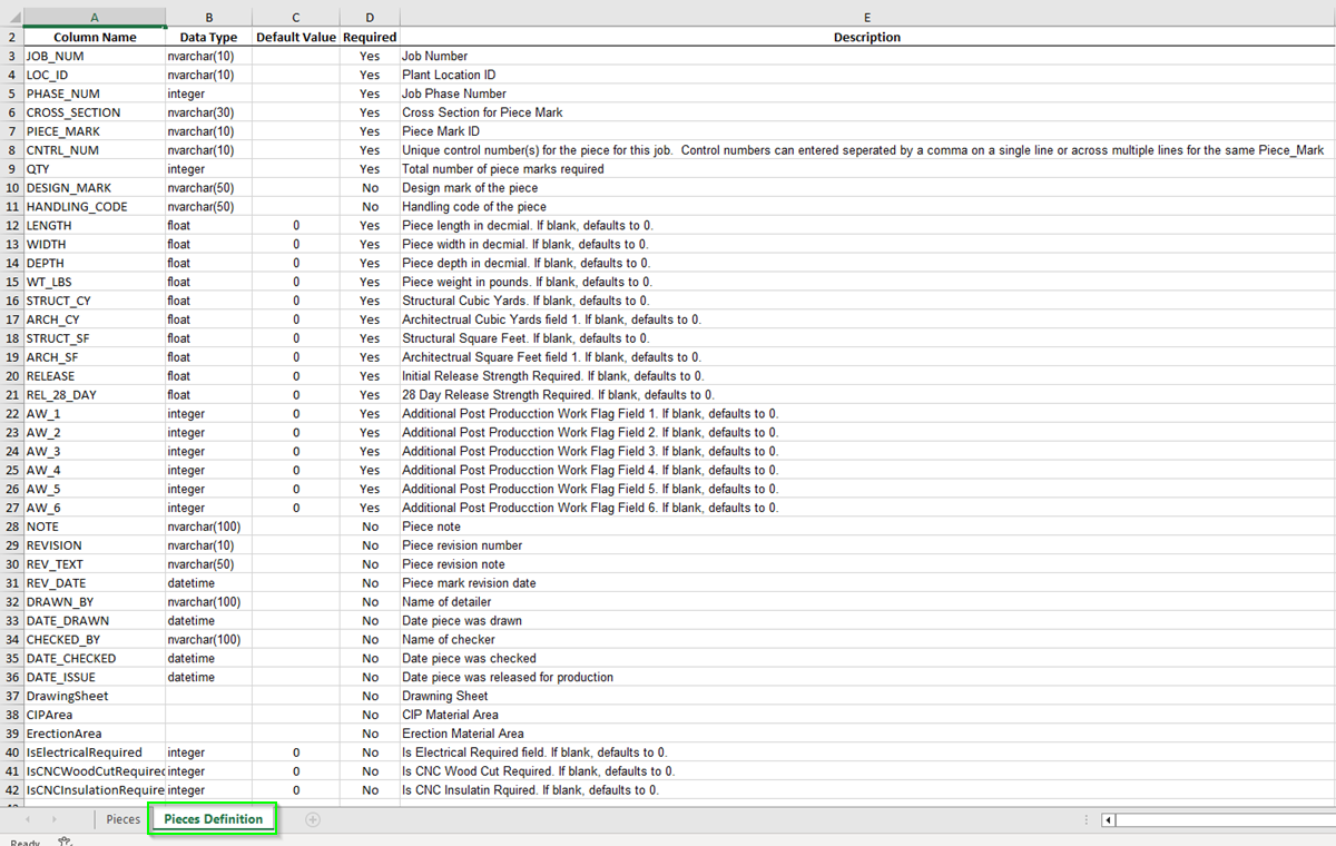 The field definitions are specified in the “Pieces Definition” Excel Sheet of each of the Excel templates (see Figure 3).