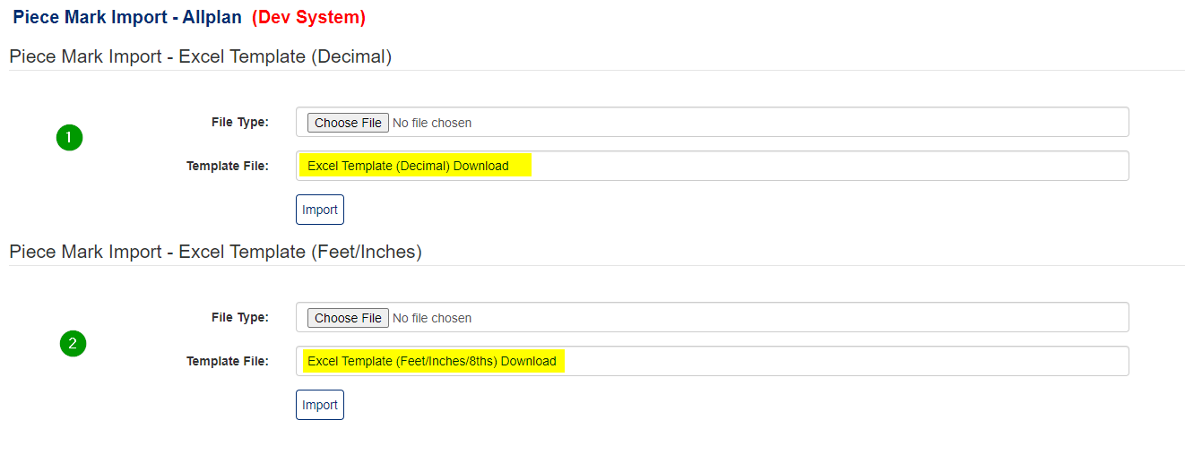 This screen allows you to import piece marks into CV using an excel file. You have a choice of using two different templates (described below). You can download these templates using the links below the file input field, highlighted in yellow as shown in Figure 2.