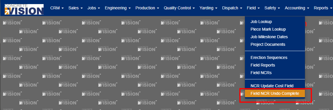 You access Field NCR Undo Complete from the Field menu > Field NCR Undo Complete menu, shown below in Figure 1.