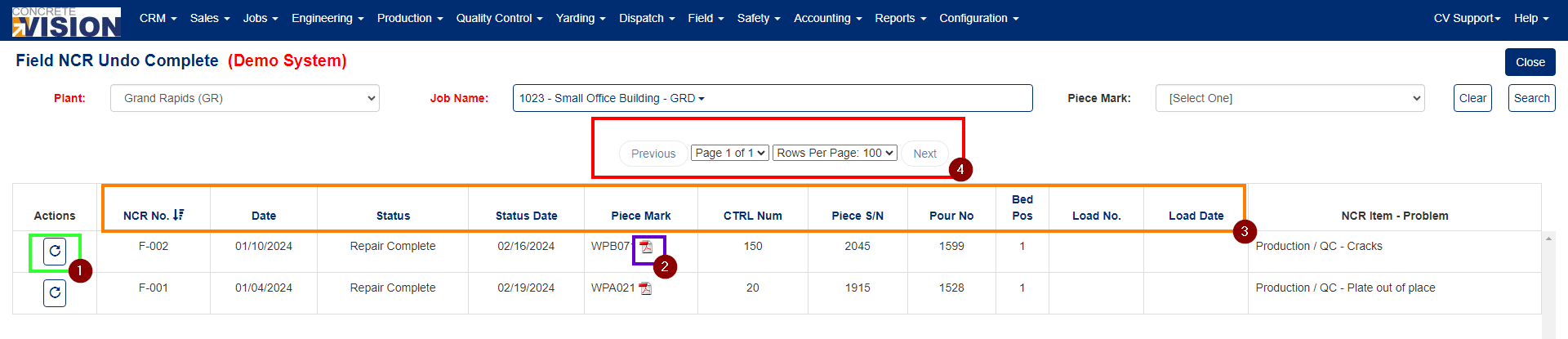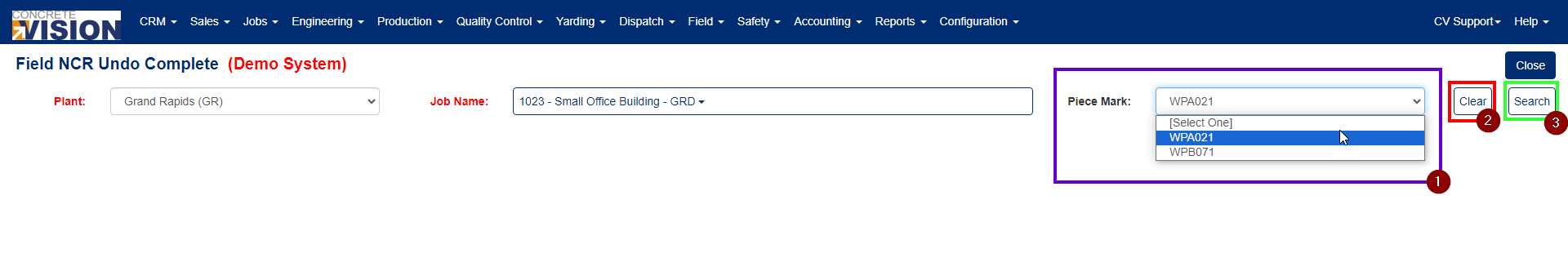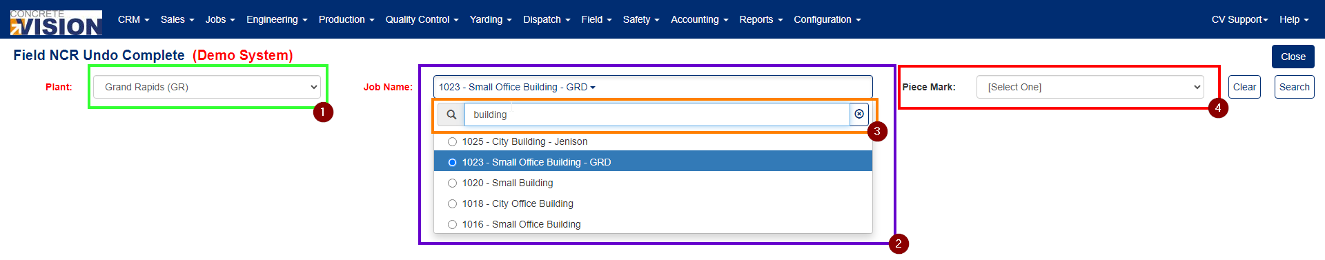 The filter is designed to be completed/filled out from left to right, so you must select a Plant (Green box number 1 in Figure 2) in order to populate the Job Name dropdown (Purple box numbered 2 in Figure 2), and you must select a Job from the Job Name dropdown to populate the Piece Mark Dropdown (Red box numbered 4 in Figure 2). You must select a Plant and Job in order to perform a Search (Green box numbered 3 in Figure 4). The Piece Mark dropdown is OPTIONAL so you do not need to select one in order to produce the list of NCR's to undo complete for.