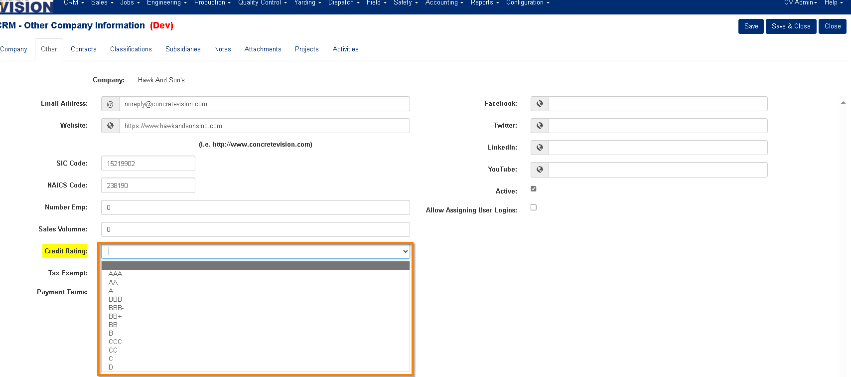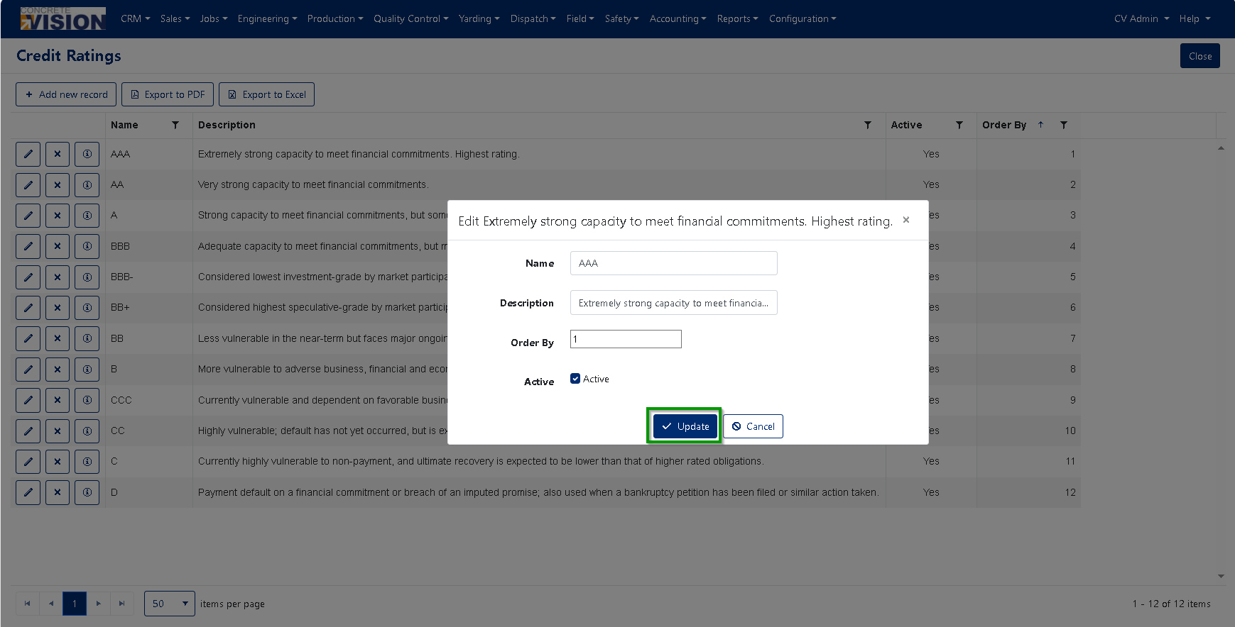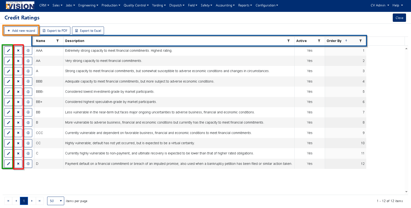 The Credit Rating tool is designed to facilitate the input and management of credit ratings for potential and current customer companies. This tool serves to create selection options for the Concrete Vision CRM (see Figure 5).